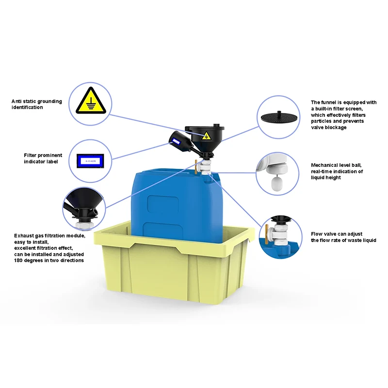 Jäätmevedelike kogumisseadmel on märkimisväärsed omadused. Selle kogumismahuti on valmistatud imporditud antistaatilisest PP toorainest, mis mitte ainult ei taga materjali stabiilsust, vaid täidab tõhusalt ka antistaatilise aine funktsiooni, kontrollides jäätmevedeliku lehtri staatilist elektrit vahemikus 10^5 kuni 10^9, vähendades oluliselt staatilise elektri põhjustatud katastroofide ohtu. Lehtril on keerukas disain. Lekkekindel pealmine kate on ühendatud tihenduskatte ja pritsmekindla filtrilehtriga ning jäätmevedeliku ladustamise ohutuse tagamiseks saab paigaldada vastavalt vajadusele klapi. Vastukaalu tüüpi ülemine kate reguleerib automaatselt heitgaaside emissiooni vastavalt siserõhu tingimustele, mis on avanevad 100 Pa ja sulguvad 50 Pa juures, vältides plahvatust ja isesüttimist. Heitgaasifilter on ühendatud spiraalselt, mis on mugav vahetada ja takistab keemiliste komponentide lendumist. Saadaval on 5 erinevat tüüpi, mis sobivad täpselt erinevate heitgaaside töötlemisega.
